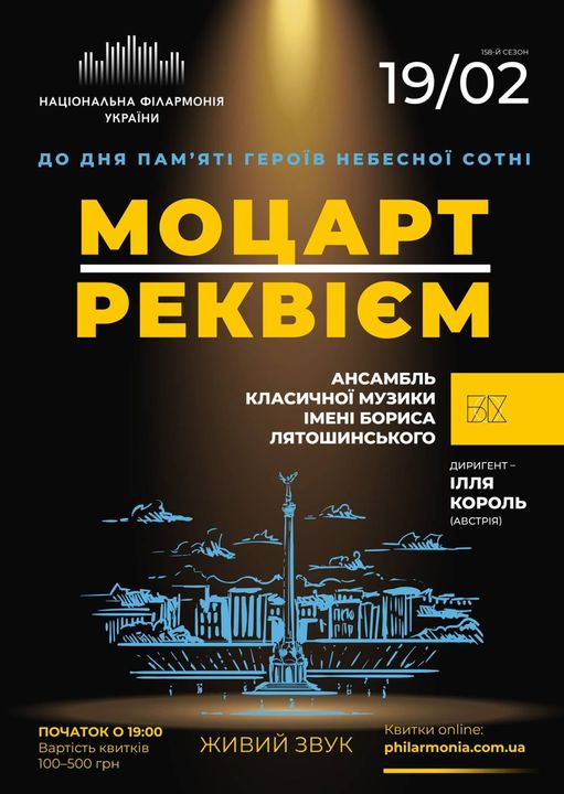 Ансамбль класичної музики імені Лятошинського вшанує пам’ять про подвиг Героїв Небесної сотні виконанням "Реквієму" Вольфганга Амадея Моцарта. Колектив Національного будинку органної та камерної музики України очолить запрошений диригент з Австрії, всесвітньо відомий фахівець з історично поінформованого виконавства Ілля Король. За словами диригента, його інтерпретація буде значно відрізнятися від звичних уявлень про моцартівський "Реквієм", сформованих масовою культурою. На концерті слухачі переконаються, що це твір не про смерть, а про життя.