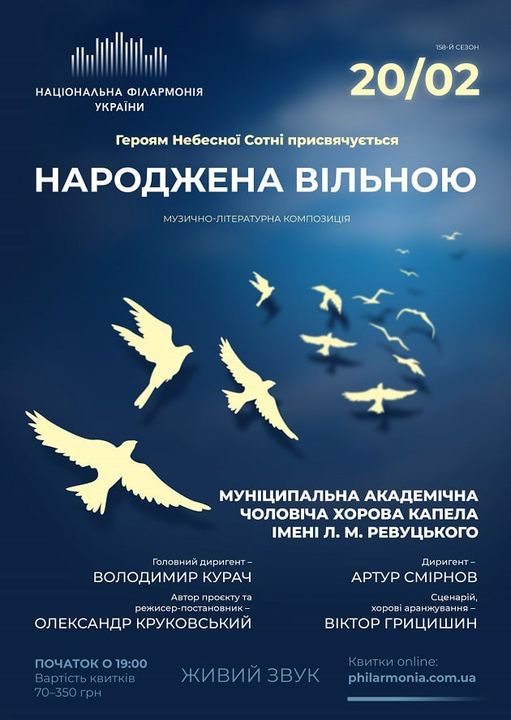 "Щороку Національна філармонія України не забуває про роковини загибелі Героїв Небесної Сотні. Саме в ці пам’ятні дні найкращі колективи і виконавці Києва, починаючи з 2014 року, дають у Національній філармонії концерти, присвячені пам’яті загиблих учасників Революції Гідності. Але такої великої кількості концертів, як цього року, у нас ще не було. Це і проєкт "Мрія про свободу" Київського камерного оркестру під орудою диригентки Наталії Пономарчук, і виконання "Реквієму" Вольфганга Амадея Моцарта Ансамблем класичної музики імені Бориса Лятошинського під диригуванням Іллі Короля, і виконання музично-літературної композиції "Народжена вільною" Академічною чоловічою хоровою капелою імені Л. М. Ревуцького з головним диригентом Володимиром Курачем", – розповідає помічниця художнього керівника Національної філармонії України Олена Зеніна.